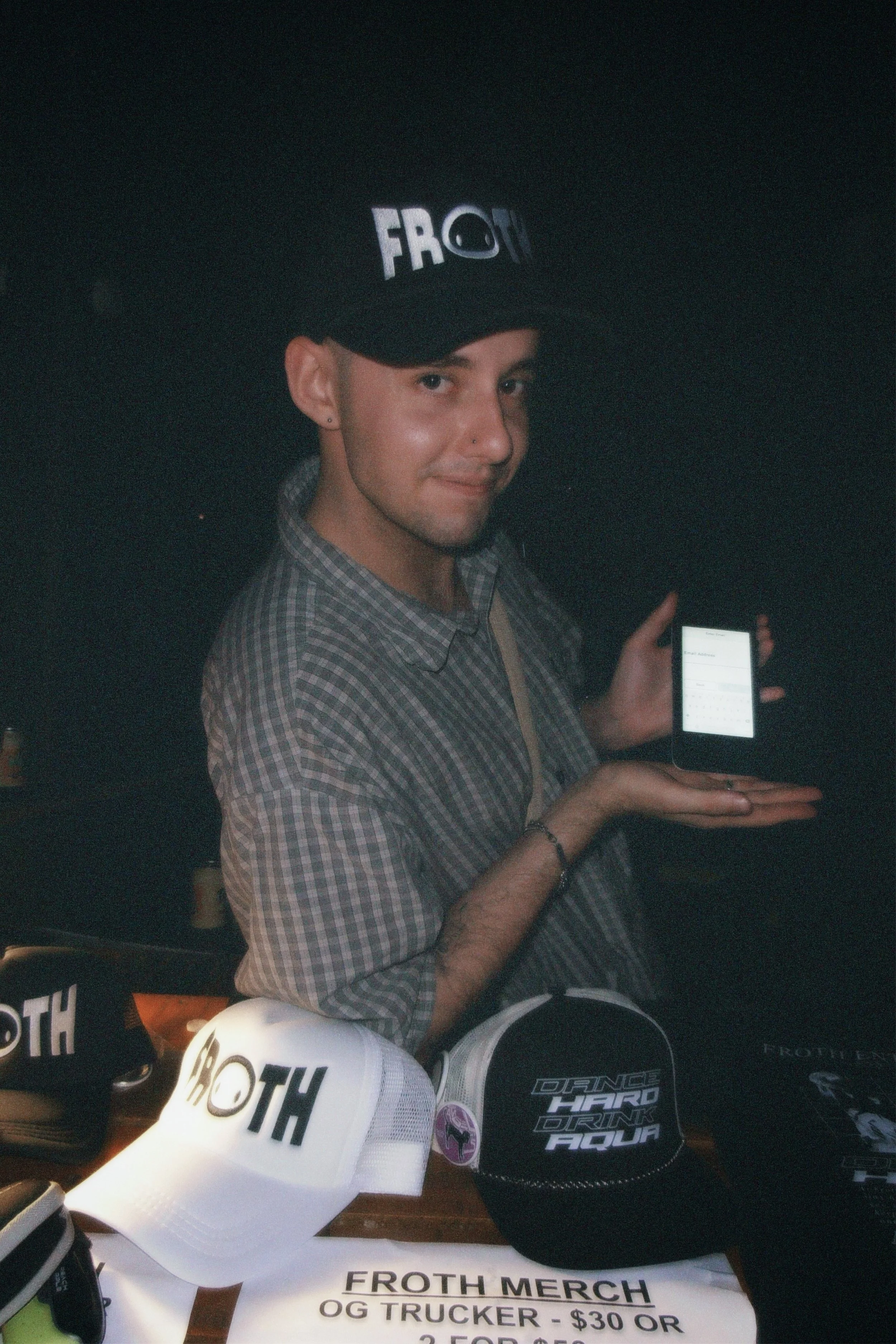 Merch Froth & Angels ‘Stay hydrated’ box hoodie $100.00 Froth & Angels ‘Stay hydrated’ T-shirt $65.00 Froth & Angels “Dance hard, Drink Aqua’ Trucker Cap $65.00 Froth OG Truckers $30.00 Froth Slip Mat $20.00